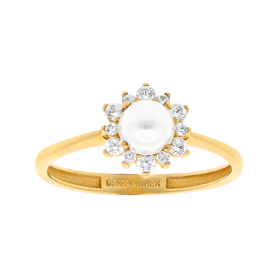 Elegancia que trasciende el tiempo. Anillo para dama en oro amarillo 14K con perla sintética y zirconia representa ese vínculo único y especial, hecha con precisión para perdurar toda la vida.