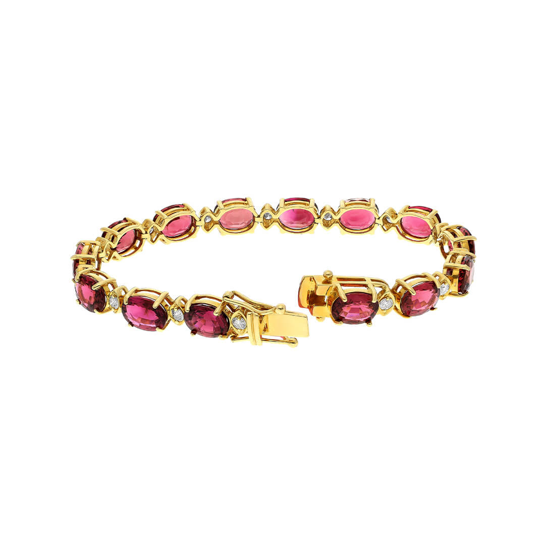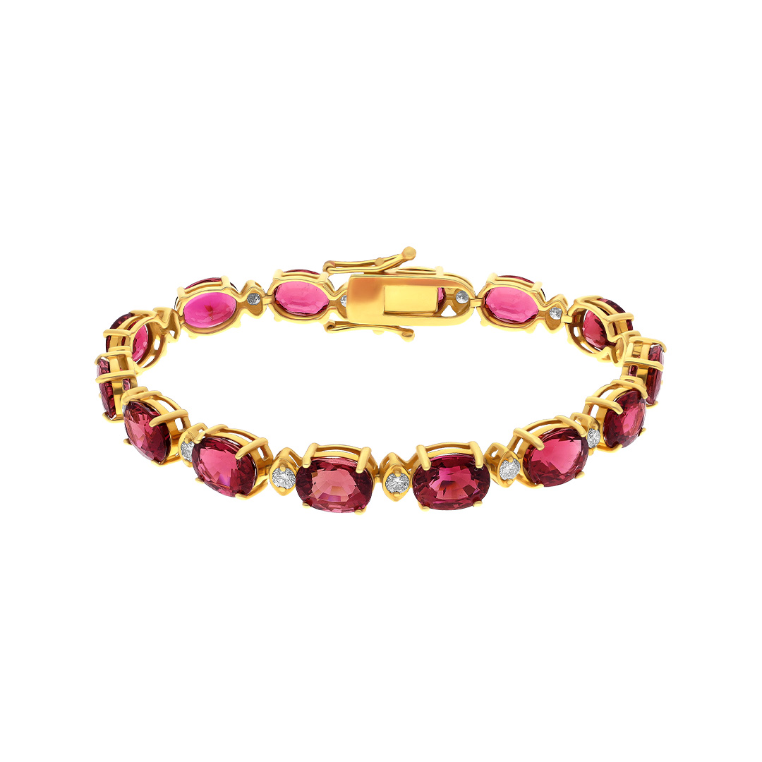 Hermosa pulsera tenis en oro amarillo 14K de 19.90grs con turmalina 26.51CT y diamante 1.15CT.