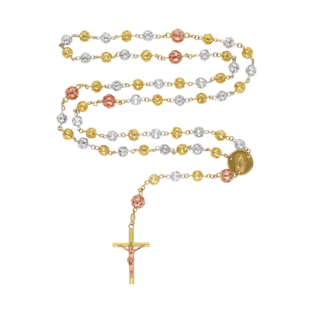 Elegancia que trasciende el tiempo. Hecha para quienes valoran la exclusividad y el buen gusto, esta Rosario en oro combinado 10K es una elección que marca la diferencia.